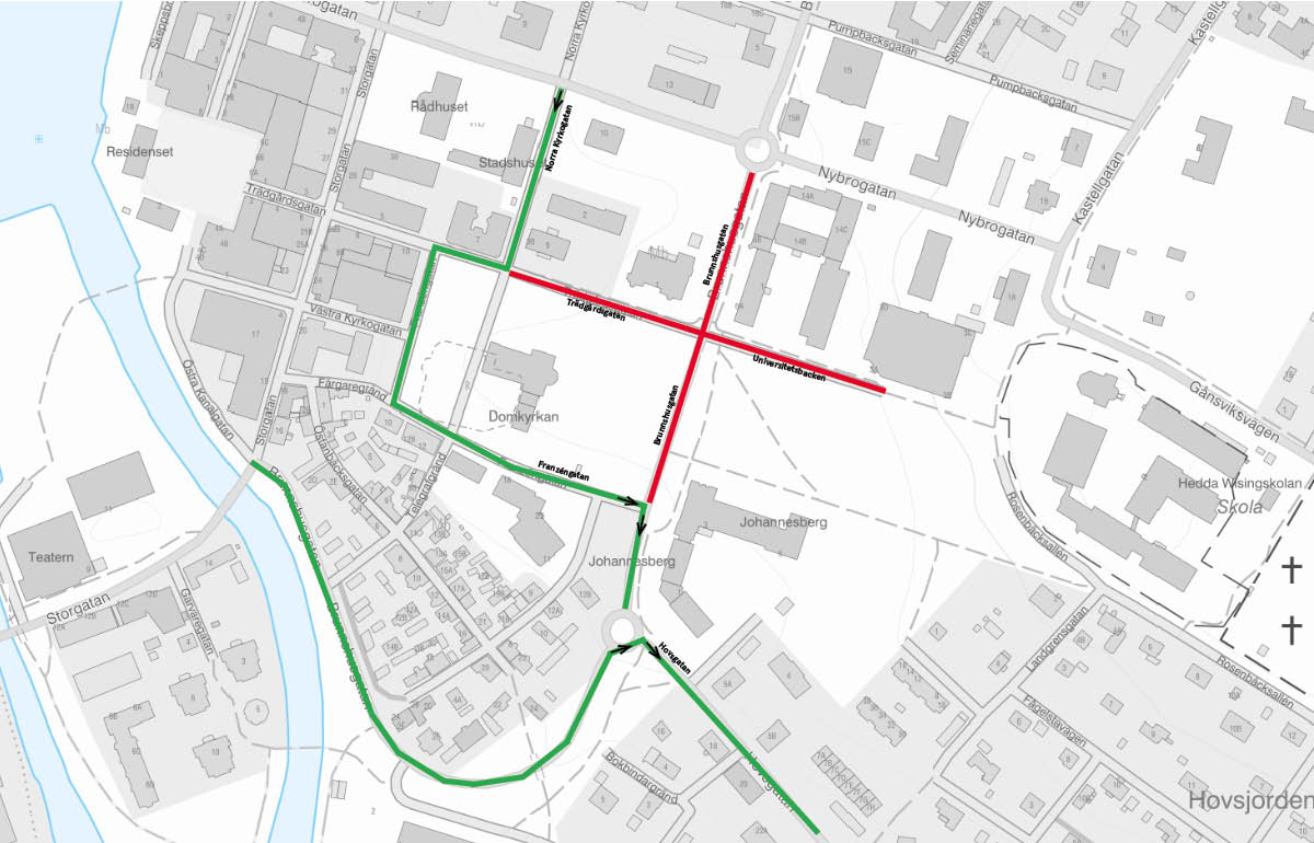 Trafik in mot Domkyrkan på Norra Kyrkogatan kan köra runt kyrkan som vanligt på Franzéngatan, men får sedan svänga höger på Brunnshusgatan.