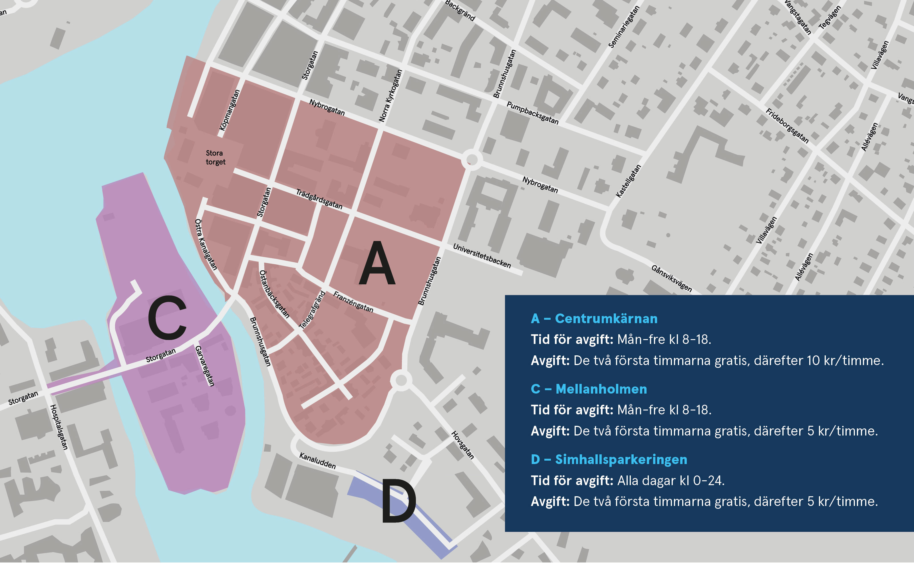 På samma sätt är avgifterna satta så att det blir billigare ju längre från centrum du står. I Centrumkärnan är avgiften 10 kronor/timme och på Mellanholmen och Simhallsparkeringen 5 kronor/timme. Men de två första två timmarna är alltid gratis i alla områden.