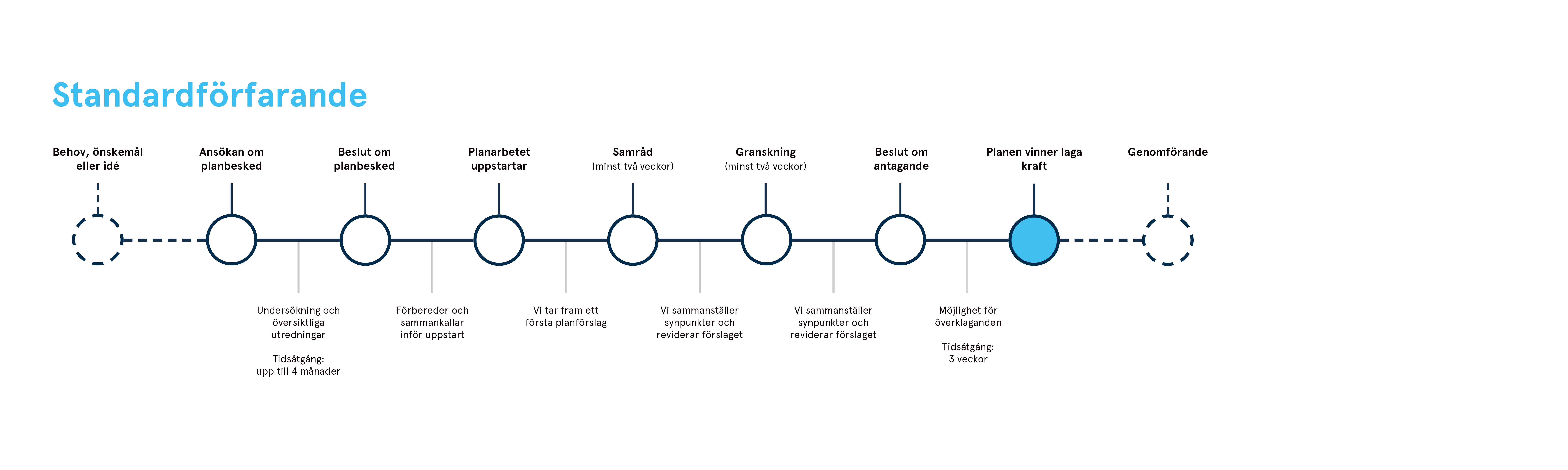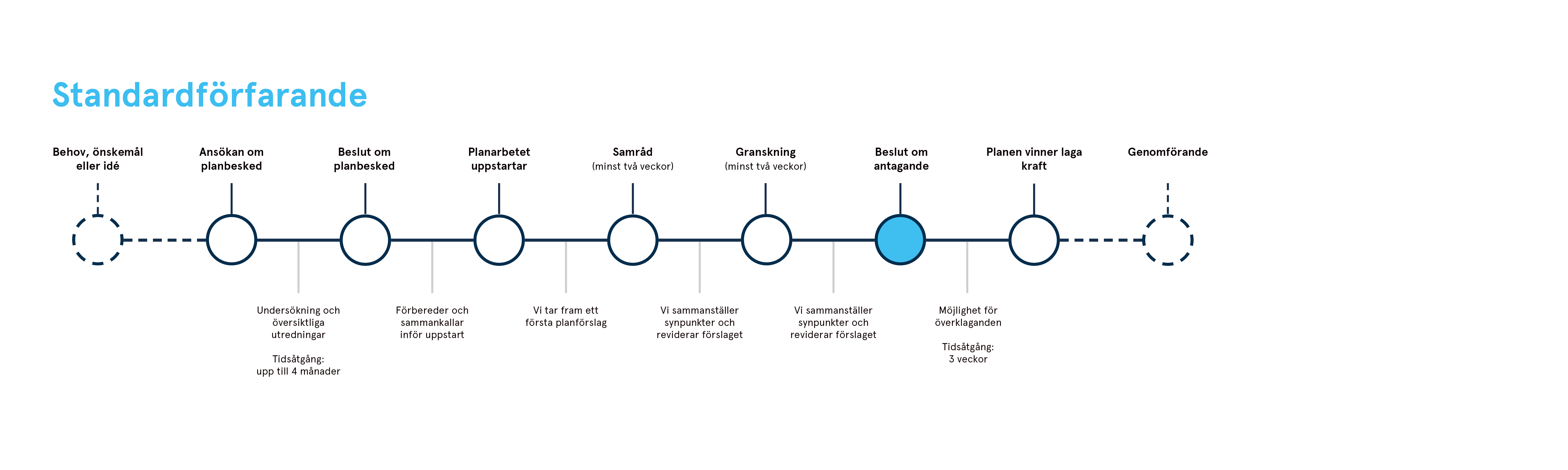Planförslaget överensstämmer med gällande översiktsplan och detaljplanearbetet hanteras därmed med ett standardförfarande enligt plan-och bygglagen (210:900).
