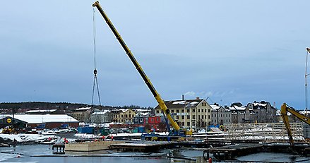 Nu är den första stora spontlådan på plats i vattnet. Den 25 ton tunga lådan lyftes från arbetspråmen och ligger nu på plats i vattnet. Måndag 20 januari börjar den ny bron byggas "på riktigt".