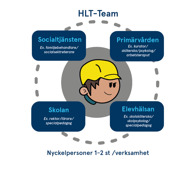 Ett team med medarbetare från socialtjänst, skola och primärvården träffas regelbundet för att tänka tillsammans kring de barn som aktualiseras till HLT-mötet. Vårdnadshavare, personal på skolan, på barn- och familjeenheten eller vårdcentralen tar initiativ till att barnet aktualiseras till HLT. För att verksamheterna ska kunna hjälpa på bästa sätt behövs vårdnadshavarnas samtycke. Verksamheterna kan då dela information med varandra på mötet och tillsammans komma fram till vilken typ av insats som kan hjälpa barnet eller familjen bäst just nu. Efter mötet kontaktas vårdnadshavarna för att få veta på vilket sätt familjen kommer bli hjälpta framöver och vem som kontaktar dem.