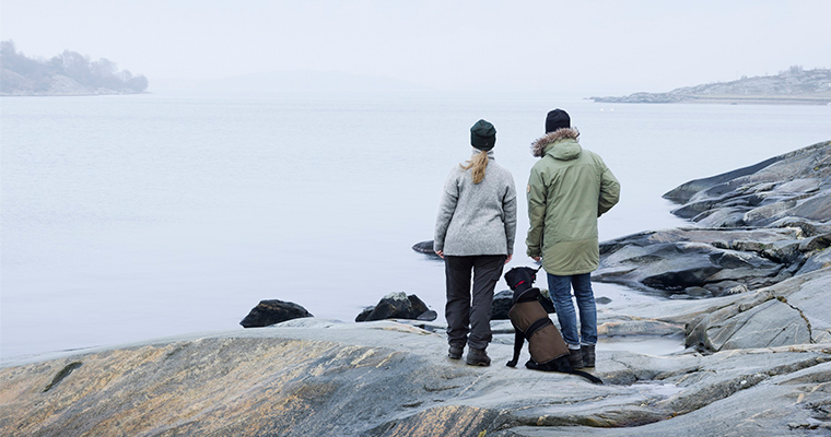 Två vuxna och en hund som står på strandområde och tittar ut mot vattnet.