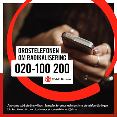Orostelefonen är en nationell stödtelefon som vänder sig till dig som är orolig över att någon i din närhet håller på att radikaliseras. Du kan också ringa om du själv befinner dig i en miljö du vill lämna.