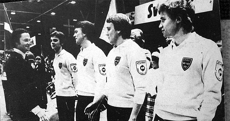 Kung Carl XVI Gustaf uppvaktade curlingvärldsmästarna från Härnösand. Från vänster: Ragnar Kamp, Håkan och Björn Rudström samt Christer Mårtensson.