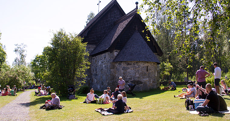 Murbergskyrkan ligger mitt i byn på friluftsmuseet.